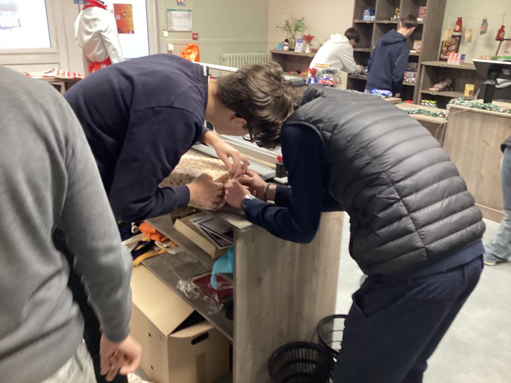 Ce projet a été mené en collaboration avec les élèves de Seconde MRCU (Métiers de la Relation Client et Usagers), qui ont apporté leur créativité à la réalisation des emballages cadeaux, rendant chaque boîte unique et festive.